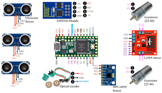 The wheelchair prototype instrumentation involves sensors, a control unit, actuators, a chassis, and communication protocols that were implemented for the correct performance of the system. The sensor distribution, control unit, communication modules, and actuators connected to the microcontroller are shown in Figure 1.