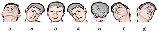 Head movements in seven directions to operate the prototype [45]: (a) Backward movement; (b) left movement; (c) stop; (d) right movement; (e) forward movement; (f) right-back movement; (g) left-back movement.