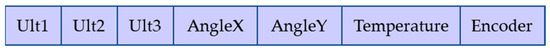 The prototype instrumentation processes information using a data vector separated by commas. This vector has data of three ultrasonics sensors, Euler angles of the inertial motion sensor (two angles are taken, since the third angle allows free mobility of the user without activating the prototype), temperature (parameter to know the status of the prototype), and optical encoder. The vector structure is shown in Figure 4. Data are processed by PythonTM, a high-level programming language.