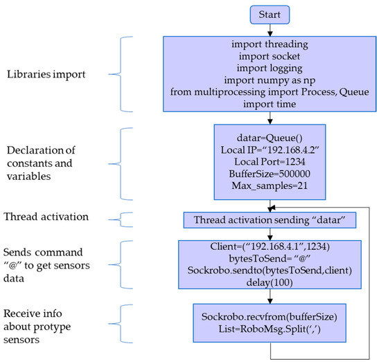 The flowchart for sending and receiving data between the computer and prototype is shown in Figure 5. Libraries importation allows to declare variables and constants, share data between threads, and start the communication to send information.