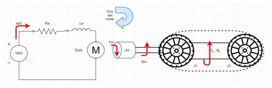 The mathematical model developed here takes into account the electromechanical model of the DC motor connected to the load. In this case, the load is a closed rack pinion system. This system has its own characteristics related to the equivalent inertia present in two wheels, which are connected using track links and a static axle, as shown in Figure 6.