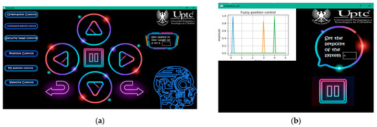 Manual control was carried out considering the instrumentation of the system by sending commands (see Table 1) to drive the prototype. In addition, a graphical interface was designed to interact with the user through buttons and a speed setting. The main window is shown in Figure 7a, where the user can manually operate the system with buttons. Figure 7b shows the window that is generated when the user clicks an automatic controller button of the main window (left buttons).