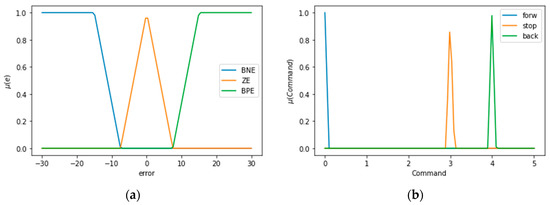 Linguistic variables allow establishing ranges in which the error will be in the desired range. The input variables are: “Big Negative Error” (BNE), when the difference between setpoint and measured value by the ultrasonic module is negative; “Big Positive Error” (BPE), when the difference is positive; and “Zero Error” (ZE), when the error equals to zero. The output variables to send commands to the prototype are “forward” (forw), “Stop” (stop), and “Come back” (back). In Figure 9a, the error established in the discourse universe is exposed. This value changes with the user input using the graphical interface. In Figure 9b, the output observed corresponds to speed commands sent to the prototype.