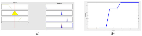 Position fuzzy control simulation using “FuzzyLogicDesigner” by MATLAB®: (a) Output fuzzy rules simulation; (b) Control surface.