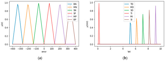 Linguistic variables for input error and output speed controller made in Google Colab: (a) Linguistic variables of speed input error; (b) linguistic variables of output speed controller.