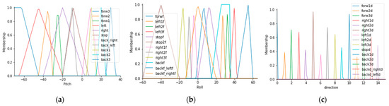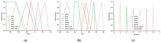 Membership functions for the inputs and outputs of the fuzzy orientation controller with constant speed: (a) Membership functions for pitch angle; (b) membership functions for roll angle; (c) membership functions for the output controller.