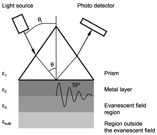 Surface plasmon resonance (SPR) is an optical measuring technique applied to test the refractive index changes occurring in very close proximity to a thin, metallic layer in which collective resonant oscillations of free electrons have been induced [,]. The foundation of SPR biosensors’ design is a metal–dielectric interface, the surface of which is functionalized by immobilization of the bioreceptor or selective ligand with respect to the analyte being detected. The interaction between the immobilized bioreceptor and captured analyte particles modifies SPR conditions, which, in turn, generate a change of the sensor’s reflectance, which can be measured and correlated with the change of the analyte’s concentration. SPR biosensors have found applications in many fields, including in environmental protection [,,,,,], biological testing [,,,,,], food safety [,,,,,], and clinical diagnostics [,,,,,].
