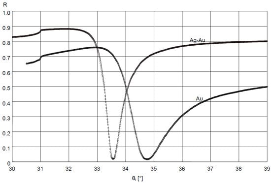 In the measuring system in the Kretschmann configuration, measurements of reflectance R as a function of angle θi (Figure 1), at a resolution of 0.01°, were conducted for the slides with Au and Ag–Au layers. The results are shown in Figure 2.