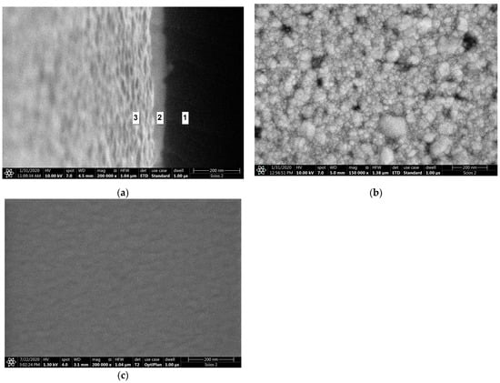 SEM images: (a) Ag–Au bimetallic layer surface morphology; (b) Ag–Au bimetallic layer in cross-sectional view made for a slightly tilted sample: 1: cross-section of glass substrate, 2: cross-section of Ag–Au metallic layer, 3: view of a tilted Ag–Au top surface; (c) Au single-metallic layer surface morphology.