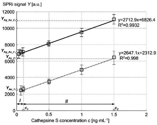 The results obtained indicate that, for very low analyte concentrations (interval I), the mean sensitivity of the Ag–Au sensor is nearly half higher than the sensitivity of the Au sensor Equation (7). In turn, for concentration c corresponding to the linear range of both biosensors’ calibration curves (interval II), sensitivity of the Ag–Au sensor is on the order of half of the sensitivity of the Au sensor Equation (10).