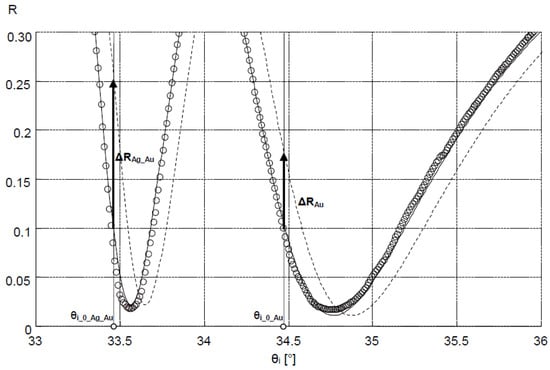 The high goodness of fit of SPR curve modeling results to experimental results of reflectance measurement of the Ag–Au layer (Figure 2) suggests the possibility of using the SPR model to estimate sensitivity SRI—the first component of sensitivity Sic from Equation (2) for the bimetallic layer, with the application of Winspall software. The good fit of the model’s results to the experiment indicates that the relative complex electric permittivity εAg and εAu values used in the model account for losses present under the conditions of the conducted SPR measurement. These losses result from, among other things, the level of roughness of the metallic surface []. Hence, for a surface with a greater roughness, the value of the imaginary component εAg″ of the electric permittivity of Ag is slightly higher than that found in the literature for smoother silver surfaces []. It also seems that the Au sensor can be modeled in a similar fashion, and the results can be used for the analysis of its sensitivity.