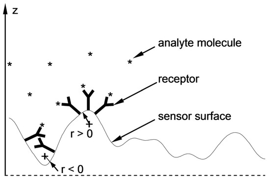Local “expansion” of the surface with a positive radius of curvature (r > 0) and the related geometric arrangement of the receptors that facilitate the attachment of analyte molecules (right side) and unfavorable geometric conditions (r < 0) for bioreceptor–analyte pair formation (left side).