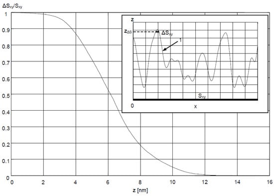 ΔSxy/Sxy as a function of z coordinate for Ag–Au sensor surface; upper right corner: side view of ΔSxy corresponding to sensor surface 1 located above coordinate zΔS and the projection of the area Sxy of the sensor surface onto the xy plane.