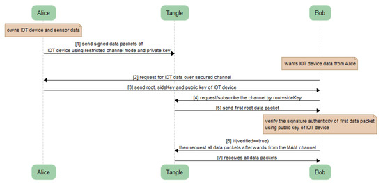 We propose to add the Edwards Curve Digital Signature scheme (Ed25519) for verifications over the shared masked authenticated message (MAM) communication protocol and implement secured and verified data channels using MAM and IOTA Tangle. The proposed DSMAM is providing similar performance to the classical IOTA MAM with additional enhanced authenticity (see Section 4.1).