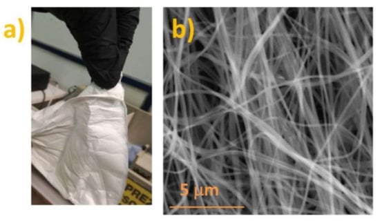 Nickel nitrate hexahydrate and manganese acetate tetrahydrate in the molar ratio of 1:2 were dissolved in distilled water and mixed with 5 mL of DMF dissolved in 5 mL of ethanol. The solution was mixed on a magnetic stirrer until all components were completely dissolved. PVP was slowly added to make a 10% polymer solution that was left to mix overnight. The mixture was loaded into a plastic syringe with a 0.8 mm diameter needle connected to a high voltage supply in an “in-house” designed electrospinning system. The applied voltage was maintained at 21.5 kV, while the rotating drum collector speed was 1200 rpm. The distance between the tip of the needle and the rotating drum collector was set at 12 cm, while the solution was pumped from the syringe at 1.5 mL/h. The fibers were collected on baking paper mounted on the rotating drum collector. As-spun fibers (as shown in Figure 1a) were peeled off from the paper and calcined in a chamber furnace in air at 400 °C for 4 h with a slow heating rate of 1°/min, in accordance with the literature [].