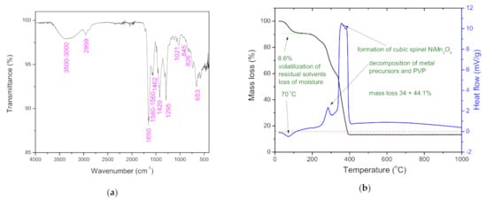 The FT-IR spectrum of as-spun fiber (Figure 2a) shows bands originating from PVP, DMF, nickel nitrate and manganese acetate precursors. OH group vibrations in the 3000–3500 cm−1 range are noted, belonging to residual water in the fibers [,,]. The bending vibration of the OH group, usually noted around 1635 cm−1 [] is possibly present but masked by the C=O stretching vibration noted at ≈1650 cm−1 of the carbonyl group in PVP []. C−H stretching, and bending vibrations of the CH2 group in PVP were noted at ≈2959 cm−1 and 1420 cm−1, respectively [,]. Tertiary amine C−N stretching vibrations can be noted at ≈1290 cm−1 [], while absorption of the C−N vibration of PVP can be noted at ≈1021 cm−1 []. CH2 rocking vibrations of PVP can be noted at ≈845 cm−1 []. The bands in the range of 1580 to 1560 cm−1 and ≈1462 cm−1 can be assigned to asymmetric and symmetric vibrations of C−O originating from the acetate ion in the manganese acetate precursor []. Vibrations of nitrate groups in the nickel nitrate precursor expected at 1620 and 1380 cm−1 are masked by the C=O stretching vibration and C−H bending vibrations of PVP, respectively []. A small vibration band at 826 cm−1 can be attributed to the bending mode of the nitrate group [], while the vibration band at 653 cm−1 can be due to both the vibrational mode of nitrate groups in the nickel nitrate precursor, and Mn−O vibration in the manganese acetate precursor [,].
