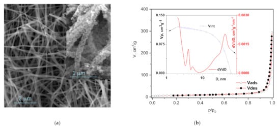 The measured nitrogen adsorption–desorption isotherm (Figure 4b) is of type II, according to the IUPAC nomenclature []. However, the obvious presence of hysteresis of the loop, in the region of relative pressure (p/p0) higher than 0.8, reveals the presence of high diameter mesopores, as well. The pore size distribution curve is given as an inset in Figure 4b and shows pores ranging from 2 to 63 nm including macropores > 50 nm besides mesopores (2–50 nm). Indeed, the value of mesopore volume (0.089 cm3/g), determined by the BJH method, represents 52% of the total pore volume determined by the Gurevich method for p/p0 = 0.99. Additionally, the most significant contribution to the total specific surface area of 25.3 m2/g, calculated using the Brunauer–Emmett–Teller (BET) equation, originates from the mesopores’ specific surface area of 21.5 m2/g (calculated with the BJH method). In contrast, the volume of micropores determined by the t-plot method is small; 0.005 cm3/g. Overall, similar to Bhagwan et al. [], we obtained high surface area mesoporous NiMn2O4 nanocrystalline fibers.