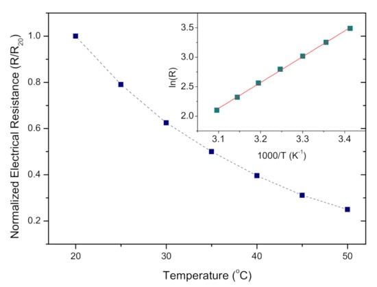 As noted before for NiMn2O4 [,,] as an NTC thermistor material, the measured DC resistance decreased with an increase in temperature (20–50 °C), following an exponential Arrhenius dependence [], as shown in Figure 5 and the equation
