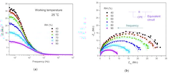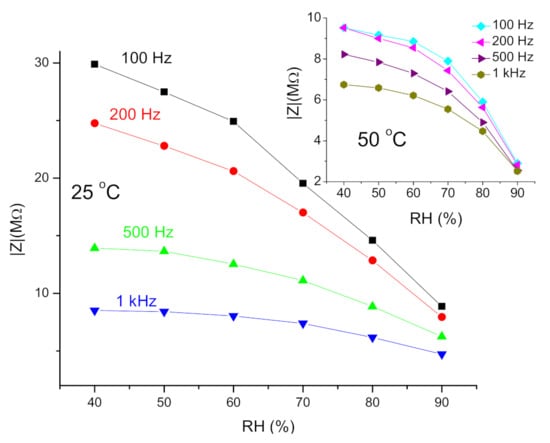 At both operating temperatures (25 and 50 °C), the measured impedance decreased with the increase in relative humidity (RH), and also with the change in frequency, as shown in Figure 6a for the operating temperature of 25 °C. The complex impedance magnitude becomes smaller with an increase in RH, as shown in Figure 6b.