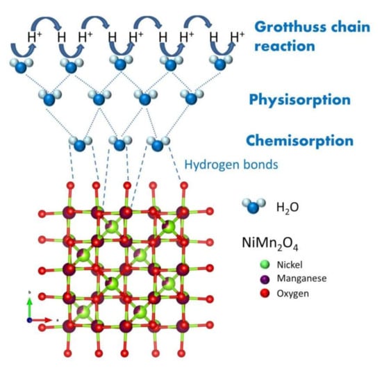 The dielectric relaxation frequency was determined as 2πfrel = 1/R⋅C and it shifted towards higher values with an increase in RH, and also with working temperature (as shown in Table 1). The determined resistance decreased noticeably with the increase in RH similar to the impedance decrease, reflecting the water adsorption (humidity sensing) mechanism (shown in Figure 8) by NiMn2O4 nanocrystalline fibers.