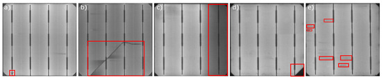 Different types of defects highlighted in Electroluminescence images. The defects are: (a) microcrack, (b) crack, (c) bad soldering, (d) break, and (e) finger interruptions.