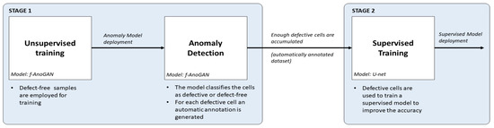 An inspection system should be able to detect the maximum number of defects, be fast to meet the established inspection time, and require the minimum human intervention in order to save resources and time. The main contribution of this work is a methodology that tries to meet these requirements by combining the accuracy of supervised models with the benefits of an anomaly detection approach, i.e., that it only requires defect-free samples for training and avoids the need for data labeling. The approach has been tailored for the detection and segmentation of different types of defects, such as cracks, microcracks, or finger interruptions, in EL images of solar cells; however, it should also be applicable in other industrial inspection tasks. The methodology is illustrated in Figure 2 and consists of two stages: