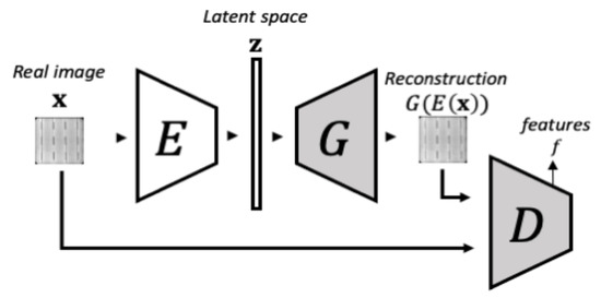 Once the training has finished, all the components are fixed and ready to be used for anomaly detection. At this point, the images are processed as in the encoder training. First, the encoder maps the images to the latent space, and then, the generator maps them back to the image space. Finally, the difference between the reconstructed and the original image defined in Equation (3) is used for anomaly detection.