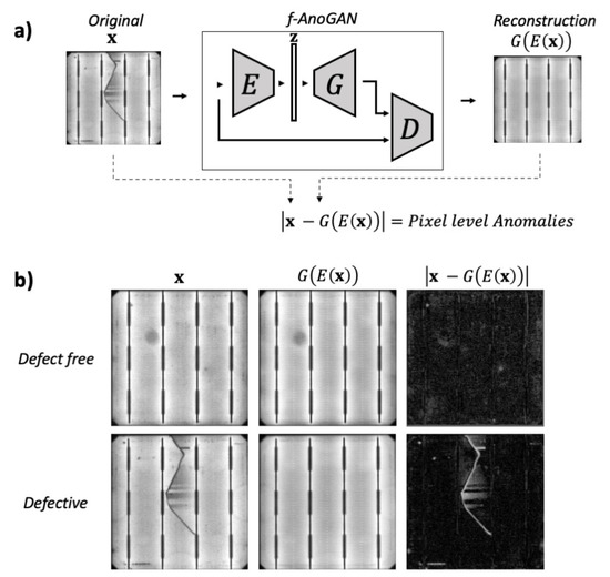 Example anomaly detection with f-AnoGAN. In (a) the final structure of the network used for anomaly detection, and in (b) some example results obtained when the network process a defect-free cell and a defective cell. This schema was inspired by the images from Schlegl et al. [41].