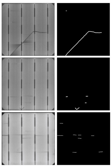 The dataset is composed of 1498 images of cells considered defect-free by the company and 375 defective cells containing cracks, microcracks, and finger interruptions. The distribution of the dataset is shown in Table 1. Each defective sample has its manually labeled pixel-wise binary annotation , as shown in Figure 6.