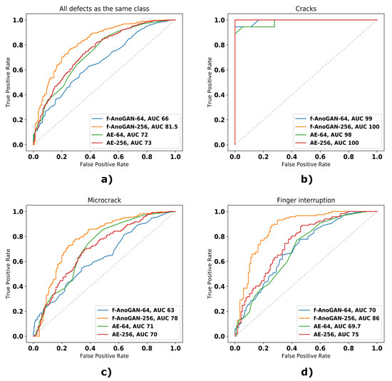 Regarding the image-level results, the network modifications had a positive impact on the results. f-AnoGAN-256 was able to detect more defects (higher Recall values) than the original f-AnoGAN-64 without incurring in more False Positive cases (higher Precision and Specificity values). This is particularly visible in Table 3 for the case of the finger interruption and microcrack defect classes where all the metrics improved over 10 points. This improvement can also be appreciated in the ROC curves and the AUC values in Figure 7 where the curve reflecting the performance of f-AnoGAN-256 appears closer to the top left corner that represents the perfect classifier, and the AUC value that changed accordingly.