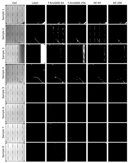 As there were few defective samples left for testing the supervised part, the performance of the models was mainly evaluated at a qualitative level, although quantitative analysis has also been reported at image-level. The Recall, Precision, and Specificity metrics have been applied considering the cells as defective if they contained more than 20 defective pixels.