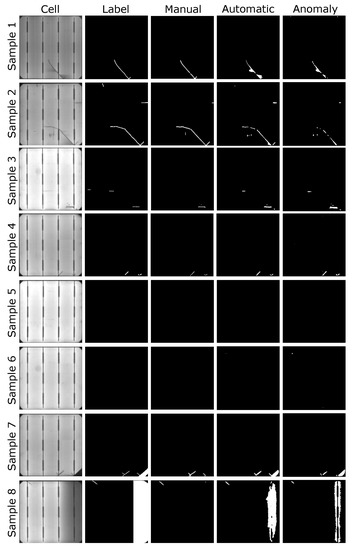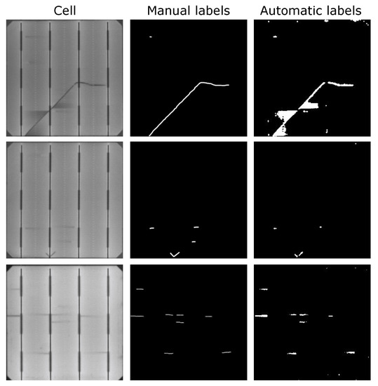 In addition, even when not considered during training and when the metrics were calculated, the automatic labels enable U-net to segment other kinds of defects. For example, in the seventh sample in Figure 10, both models were able to detect the microcrack, but the break at the bottom right was only detected by the models trained with automatic labels. The same happened in the last row sample where the bad soldering was not segmented when using manual labels.