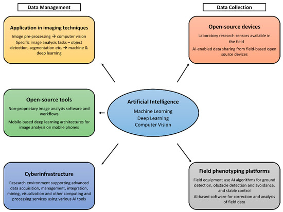 In addition to image analysis, AI applications that are widely used in other domains of science are now being integrated into the phenomics data management pipeline. Cyberinfrastructure (CI), a research environment that provides linkages between researchers, data storage, and computing systems using high-performance networks has been applied widely in the environmental sciences [26,27,28]. CI is now being applied to phenomics in order to facilitate collaboration among researchers [29]. Open-source devices and tools represent another fast developing application of AI technologies [30]. In phenomics, these tools are addressing the challenges of expensive phenotyping equipment and proprietary or incompatible data formats. The growth of these applications of AI has expanded the field of phenomics with industry companies investing in the manufacture and distribution of phenotyping technologies alongside government-funded agricultural institutions.