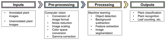 Computer vision is the major aspect of artificial intelligence that is applied in these imaging techniques. Zhuang et al. 2017 [34], comprehensively state that “computer vision aims to bring together factors derived from multiple research areas such as image processing and statistical learning to simulate human perception capability using the power of computational modeling of the visual domain.” Computer vision uses machine learning to recognize patterns and extract information from the images. The computer vision workflow (shown in Figure 2) carries out visual tasks ranging from pre-processing (e.g., conversion of image formats, color space conversions etc.) to object detection applied in ML algorithms, resulting in the comprehension of image understanding in a human-like way [34]. Computer vision transforms the images so that they can be applied to an AI system. This process has high computational demands, especially when working with images of varying formats from a range of sensors, as is the case in phenotyping imaging techniques [32]. A few of the different imaging techniques are discussed below.