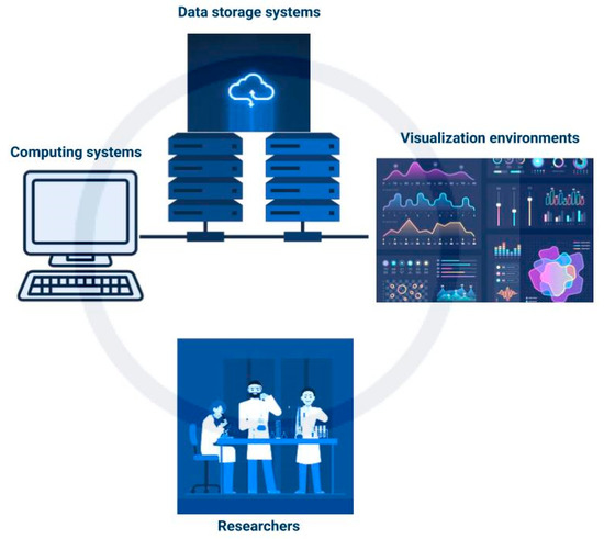 Cyberinfrastructure (CI) is described by Atkins et al. 2003 [95] as a “research environment that supports advanced data acquisition, storage, management, integration, mining, visualization and other computing and processing services distributed over the internet beyond the scope of a single institution.” It consists of computing systems, data storage systems, advanced instruments and data repositories, visualization environments, and people (shown in Figure 3) linked together by software and high-performance networks [27]. This enhances the efficiency of research and productivity in the use of resources. Some CI systems can provide for in-field data analysis to point out errors in data collection that can be rectified and identify further areas of interest for data collection.