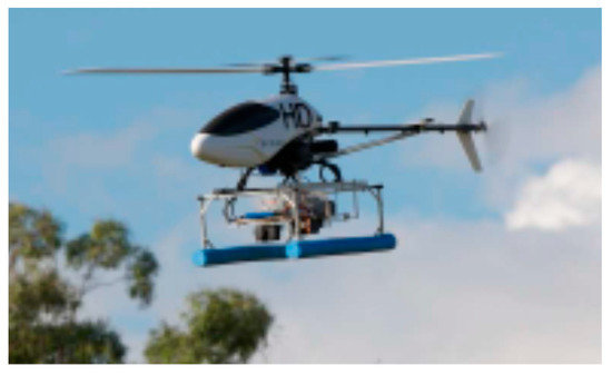 Unmanned aircraft are particularly attractive for data acquisition because they enable sensing with a high spatial and spectral resolution for a relatively low cost. Unmanned helicopters (such as the one shown in Figure 4) can carry various sensors and have the accommodation to carry larger sensors. In windy conditions, helicopters enable precise flight control and operations in cluttered environments because of their maneuverability and ability to fly at low speeds. Replicated collection of sensor data can be achieved through automatic flight control when the helicopter is equipped with algorithms for ground detection, obstacle detection and avoidance, and stable effective control [113]. Modern unmanned aerial systems (UAS) are better equipped to manage the harsh environmental conditions and obstacles due to rapid advances in technology such as collision technology, optical sensors for machine vision, GPS, accelerometers, gyroscopes, and compasses. However, they still face the challenge of limited battery power, with electric batteries providing between 10 to 30 min of battery power [25].