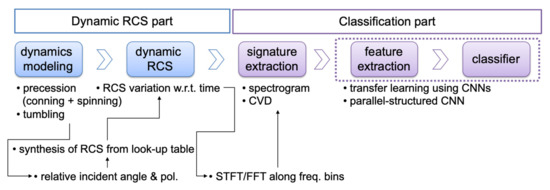 Figure 1 shows the overall diagram of our proposed solution, which is organized with two parts: dynamic RCS pat and classification part. The dynamic RCS part includes the dynamic modeling of targets and estimating dynamic RCS of targets. In the classification part, the micro-Doppler signatures such as spectrogram and CVD are extracted from the dynamic RCS and the generated signature images are used to train and test the conventional and parallel-structed CNNs.