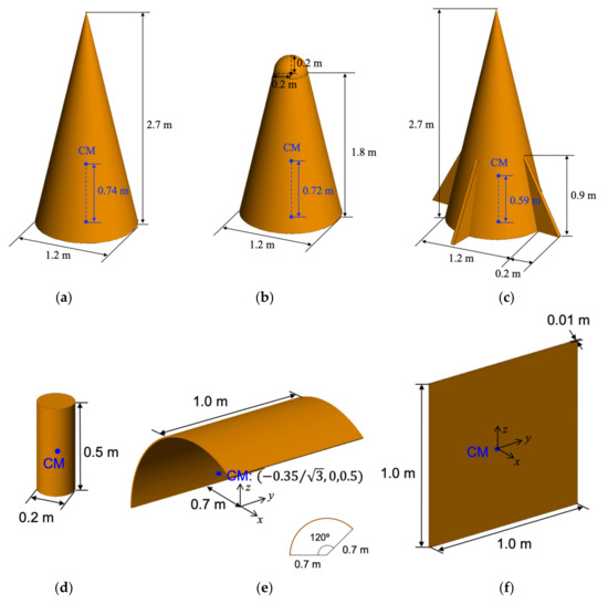 In this paper, three cone-shaped targets and three debris are considered: cone, rounded cone, cone with empennages, cylinder, curved plane, and squared plane, as shown in Figure 2. The cone-shaped target models are based on the same geometric cone and debris are considered in shapes that can be separated from missiles. The center of mass of each model is estimated by using the Altair Hypermesh.