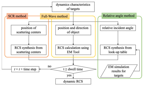 We estimated the dynamic RCS, which is the squared magnitude of the scattered field with respect to time, under the assumption that the quasi-static mode is established on a frame-by-frame basis with sampling intervals instead of a time continuous model. As shown in Figure 3, the dynamic RCS can be obtained from three methods: SCR, full-wave, and relative angle methods. The pros and cons of these methods are summarized in Table 1. As mentioned before, the SCR method is a time-saving method, but it is only valid for simple targets. Contrastively, the full-wave method provides an accurate solution, but it is very time-consuming since the targets are rotated according to the dynamic characteristics at every time interval and are simulated by using an electromagnetic full-wave tool such as Altair’s FEKO and CST MWS. Meanwhile, the relative angle method utilizes a look-up table that configures the RCS values of a target with a fixed direction for all possible incident angles, and it uses the relative angle between the incident angle and the object direction as an input parameter of the look-up table instead of changing the target in real direction. It takes a lot of time to create the lookup table, but the relative angle method has a faster computation time than the full-wave method since it does not perform the electromagnetic analysis every time step like the full-wave method. Especially, the relative angle method has an advantage in the symmetric-structured target since the lookup table can be reduced. In our work, the relative angle method is used to calculate the dynamic RCS since the RCS of the cone-shaped targets does not vary with the azimuth angle, ϕ. Therefore, the lookup table is configured with the RCS values of cone-shaped targets with respect to the elevation angle. In practice, debris models that are not longitudinally symmetrical, as shown in Figure 2c,e,f, require a larger lookup table. The electromagnetic calculation of the targets was fulfilled by our in-house code, which is implemented by the SBR [29].