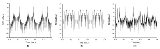 Figure 5 shows the estimated RCS versus time curve of the cone-shaped target models with a rotation rate of 3 Hz, a precession angle of 10 degrees, and an incident angle of 5 degrees. For the cone model, the dynamic RCS has peaks when the incident field normally illuminates the cone’s side surface. For the dynamic RCS of the rounded cone, since the rounded tip strongly reflects the incident field, there are more peak points. Meanwhile, the cone with empennages has more complex RCS pattern due to empennages causing multi-path. In these figures, we can roughly notice that the rotation rate is about 3 Hz and the dynamic RCS has different patterns depending on the shape of cone-shaped target.