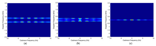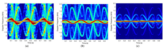 Next, to simulate the radar signal returned from a target, the radar parameters are required. Assume that the radar operates at a X-band; that the pulse repetition frequency (PRF) is 5 kHz; and that these pulses are transmitted during the dwell times of 1, 2, and 4 s. These parameters are summarized in Table 3 and are chosen by referring previous literatures [6,15,16,30,31]. Especially, it is known that the detection of the micro-Doppler modulation generated by vibration may not be possible at low radar frequency bands, and it is recommended that the operating frequency should be the X-band (8–12 GHz) for detecting centimeter-level displacement [30].