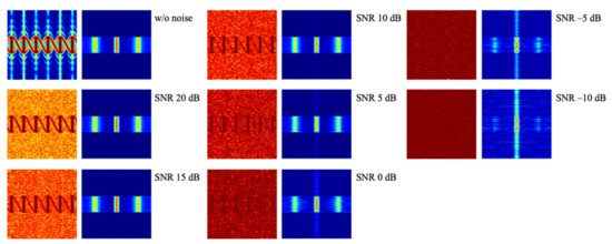 In the radar signal calculated earlier, no noise was taken into account. In practice, there are many noise sources at the radar receiver. In addition to noise generated by the radar receiver, background noise collected from the antenna appears at the radar receiver. To consider the noise effect, the white Gaussian noise is added to the radar signal with the SNR varying by 5 dB in the range of −10 to 20 dB, as shown in Figure 8.