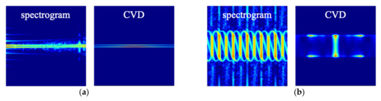 Spectrogram has various patterns according to dynamic parameter and models, while CVD has relatively simple patterns, as shown in Figure 9. Considering the characteristics of the CNNs that extract features based on the pattern of the image, the spectrogram is more suitable for classification using CNN than CVD. On the other hand, as the dwell time increases, the results learned by spectrogram and CVD have higher accuracy. The micro-Doppler signatures are generated for the target with the rotation rate of 0.25 to 3 Hz. If the rotation rate is 0.25 Hz, only 1/4 cycle of the signal is received during the dwell time of 1 s. Moreover, the low rotation rate has small micro-Doppler frequency, as shown in Figure 10. Therefore, the short dwell time and low rotation rate reduce the accuracy.