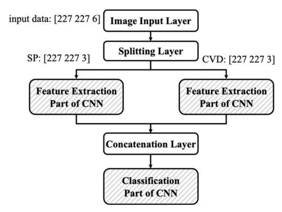 For higher accuracy, we construct two identical CNNs in parallel in which one CNN has the spectrogram and the other CNN has the CVD as the input image, as shown in Figure 11. Since the network generally is a combination of two components: feature extraction part (convolution and pooling layers) and the classification part (fully connected layers), two identical feature extraction parts are arranged in parallel and the outputs of two parts are concatenated and used as an input of one classification part. According to the results of Table 4, the ResNet-18 has high accuracy as well as short training time. Therefore, the ResNet-18 is used to construct the parallel-structured CNN model.