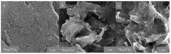 Figure 2. FE-SEM images of (a) bare screen-printed paper electrode (SPPE), (b) SPPE modified with graphene oxide (SPPE/GO), (c) 5′NH2 ssDNAprobe modified SPPE/GO (SPPE/GO/ssDNAprobe).
