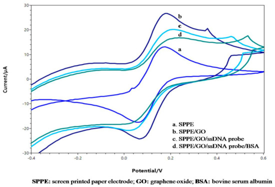 As shown in Figure 4 curve b, the Rct value of SPPE/GO (Rct = 0.019 kΩ) was found to be lower than the bare SPPE (Figure 4, (curve a) Rct = 6.12 kΩ). The decrease in electron transfer resistance was attributed to the modification of SPPE by GO that enlarged the surface area and enhanced the electron transfer on electrode surface. In the next step, the attachment of ssDNAprobe onto the SPPE/GO further increased the Rct = 0.91 kΩ value (Figure 4 curve c), indicating the hindrance in electron transfer on the electrode surface. The increase in Rct value resulted from the negatively charged phosphate group of DNA that caused repulsion to the redox probe, [Fe(CN)6]3−/4−. Further covering of the exposed electrode surface by BSA caused the blockage of the electrode surface and, consequently, Rct = 2.12 kΩ increased (Figure 4 curve d).