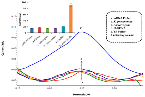 The selectivity of the DNA sensor was evaluated by comparing the sensor response in terms of peak current with respect to the Probe with the ssGDNA of O. tsutsugamushi and other bacterial GDNA (L. interrogans and K. pneumonia). As shown in the Figure 6 curve a to g, a negligible difference in peak current was observed with respect to the probe after hybridization with the non-targeted DNA samples. A considerable hike in peak current was observed only when the targeted sample (ssGDNA of O. tsutsugamushi) was hybridized with the probe, confirming the selectivity of the sensor. The TE buffer was taken as a blank in the study, and H-GDNA was taken as a negative control.