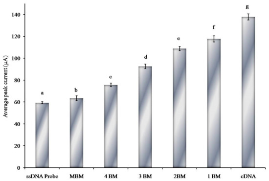 As shown in Figure 7, the average peak current value was highest in the case of cDNA (Figure 7g), and a decline in average peak current was observed (Figure 7b–f) with an increase in the number of mismatched bases. Equivalence with respect to the probe was recorded in the case of the multiple base mismatched DNA sequences (Figure 7b), confirming that the sensor is specific only to the complementary sequence.