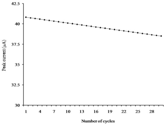 The stability of SPPE/GO/BSA/ssDNAprobe was evaluated using CV after hybridization with ssGDNA of O. tsutsugamushi (Figure 8). The sensor response in terms of peak separation remained unchanged until 30 repetitive cycles with only a 5.7% overall decrease (0.2% decrease per cycle) in peak current with respect to the initial response.