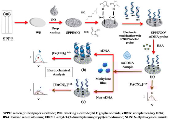 The screen-printed paper electrode (SPPE) consisting of a working electrode (carbon), counter electrode (carbon), and reference electrode (Ag/AgCl) was used as a matrix for the development of the electrochemical DNA sensor. The WE surface was modified with GO nanoparticles using the drop casting method. The working electrode (WE) surface was washed with ethanol, followed by distilled water to remove the adsorbed impurities from the surface. Then GO (1 mg) was dissolved in DMSO solution (1 mL) and sonicated at 40 °C for 20 min. This suspension (3 µL) was added onto the WE and dried at 40 °C. The electrode was then washed with distilled water to remove the unbounded material from the surface.